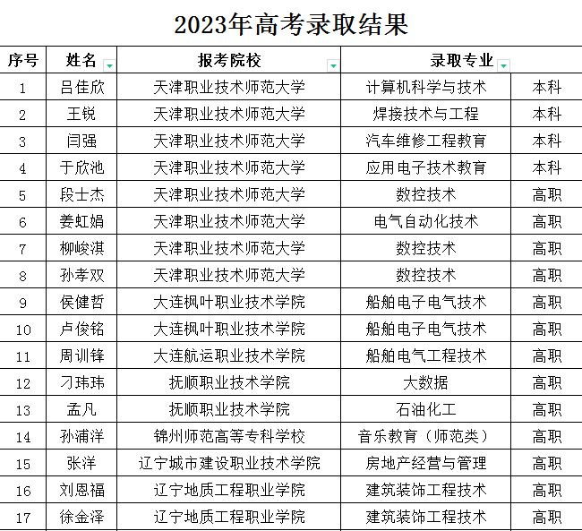 丹東市技師學院學子在2023年對口升學單招考試中再次取得優(yōu)異的成績,共有63人考取理想的大學,其中8人被天津職業(yè)技術師范大學錄取,55人考上省內(nèi)高職院校。