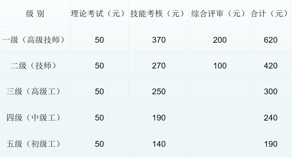 學(xué)院根據(jù)《關(guān)于印發(fā)<職業(yè)技能等級(jí)認(rèn)定工作規(guī)程(試行)的通知》(人社職司便函[2020]17號(hào))和《省發(fā)展改革委、省財(cái)政廳關(guān)于繼續(xù)執(zhí)行職業(yè)技能鑒定收費(fèi)標(biāo)準(zhǔn)及有關(guān)事項(xiàng)的復(fù)函》《遼發(fā)改收費(fèi)函[2020]109號(hào)》文件精神,結(jié)合我院職業(yè)技能等級(jí)認(rèn)定工作實(shí)際情況,收費(fèi)標(biāo)準(zhǔn)如下: