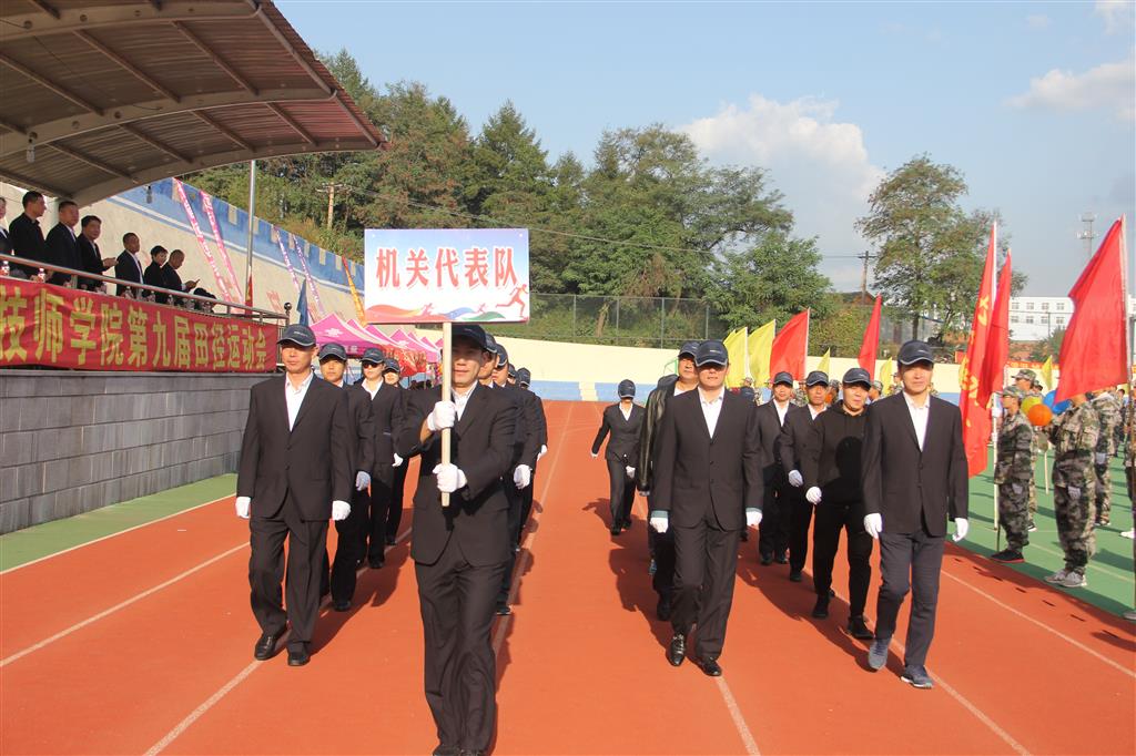 伴著激昂的樂曲,在鮮艷的五星紅旗的引領(lǐng)下,校旗隊、彩旗隊、各班的方陣排成整齊的隊列,邁著雄健有力的步伐經(jīng)過主席臺接受檢閱,由實習(xí)代表隊、教務(wù)代表隊、后勤保障代表隊、機(jī)關(guān)代表隊組成的四個教工方隊壓軸入場,教工們身著工裝,精神抖擻,接受檢閱。